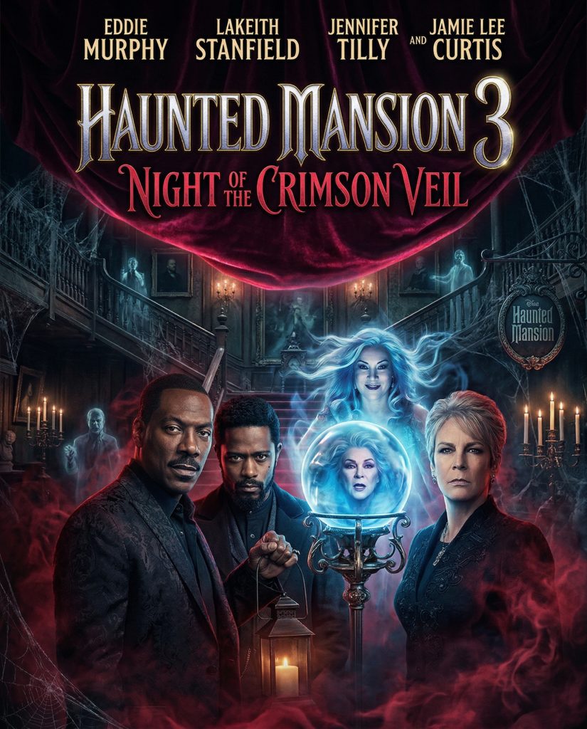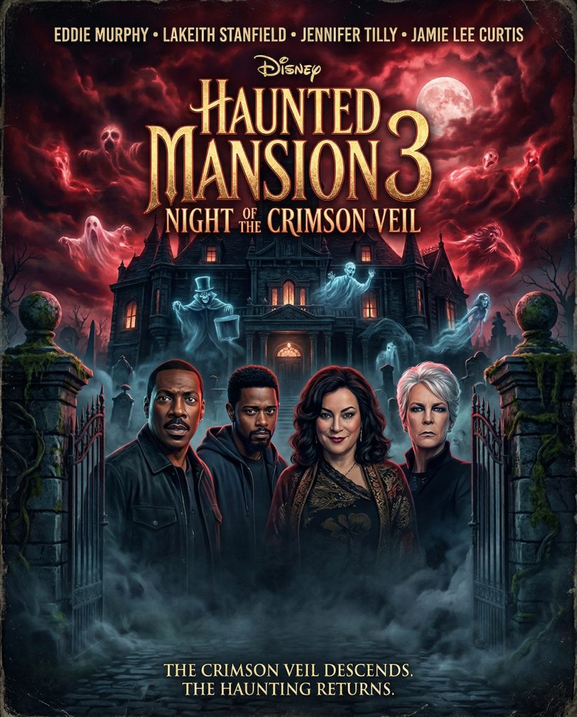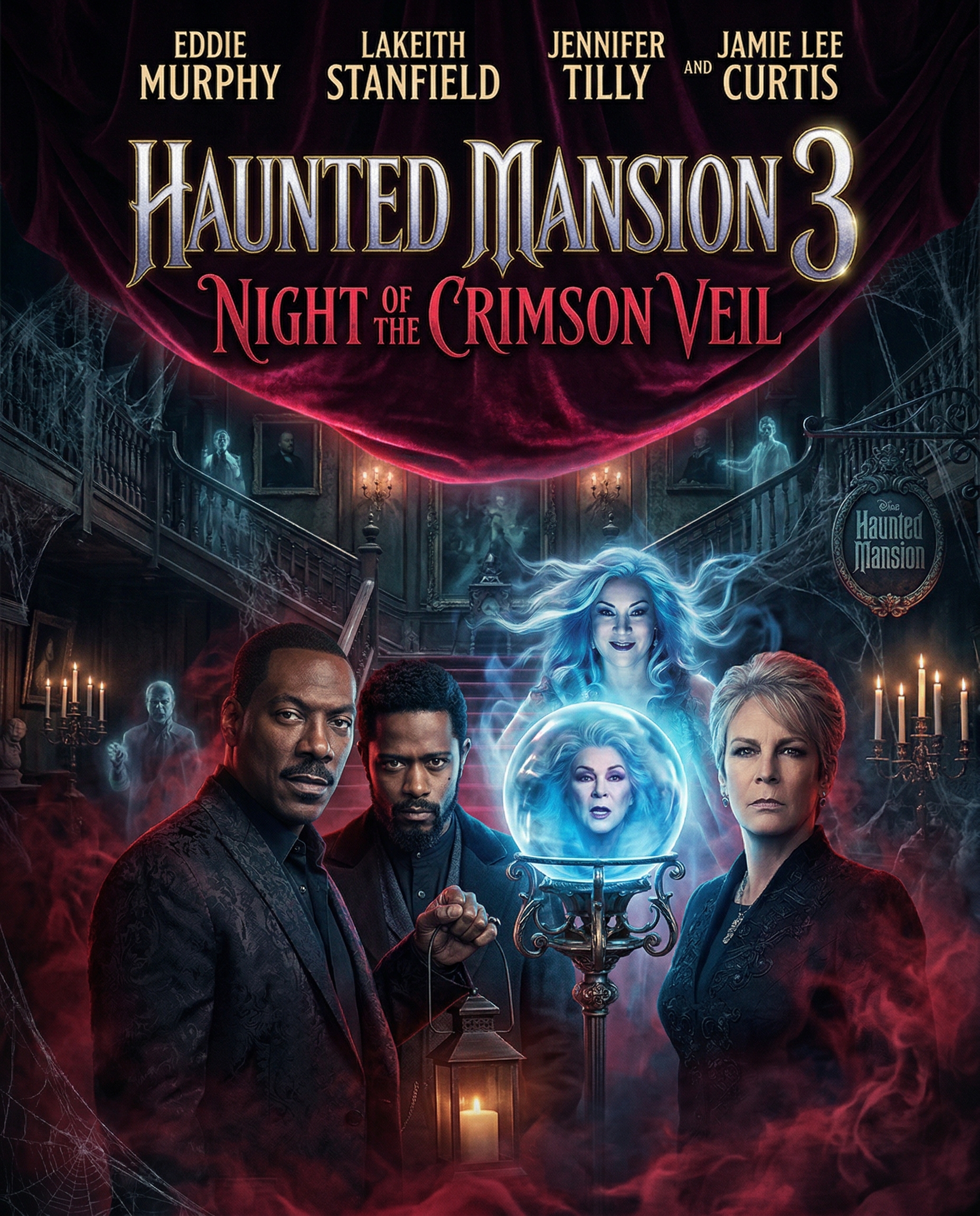 Haunted Mansion 3: Night of the Crimson Veil (2026) imagines a darker new chapter in which a blood-red supernatural veil descends over the mansion, awakening an ancient evil buried deeper than any ghost the house has ever known. As the walls begin shifting and the spirits grow more violent, new and returning characters are pulled into a chilling battle between memory, curse, and revenge. With Eddie Murphy, LaKeith Stanfield, Jennifer Tilly, and Jamie Lee Curtis in one imagined crossover cast, the mansion becomes the center of a gothic nightmare where past and present collide.